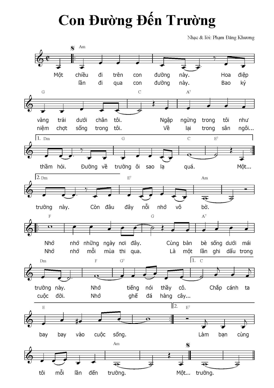 CON ĐƯỜNG ĐẾN TRƯỜNG Author. Học làm MC chương trình On. 6:41 PM Thieu Nhi Sheet CON ĐƯỜNG ĐẾN TRƯỜNG của nhạc sĩ Phạm Đăng Khương. Share with your friends